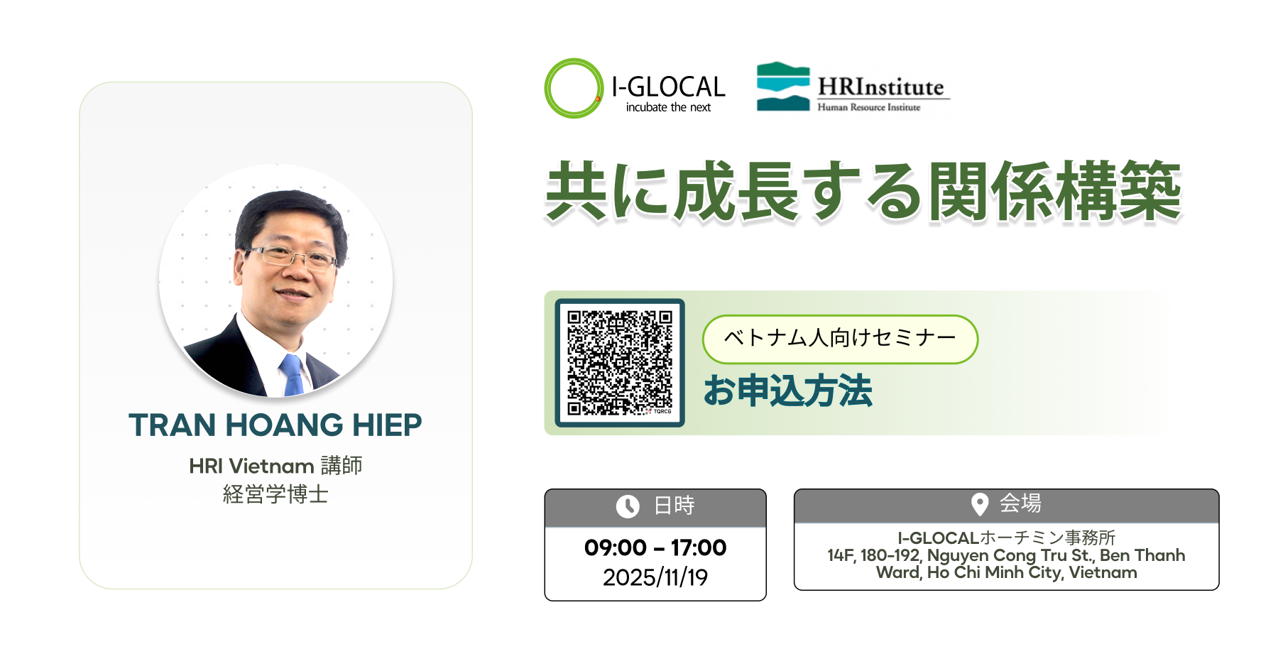 HRI VIETNAM様とI-GLOCALが共催する本セミナーは、人とのつながりを高めたい方、個人としての影響力を強化したい方、そしてあらゆる職場環境で信頼関係を築きたい方向け設計されています。