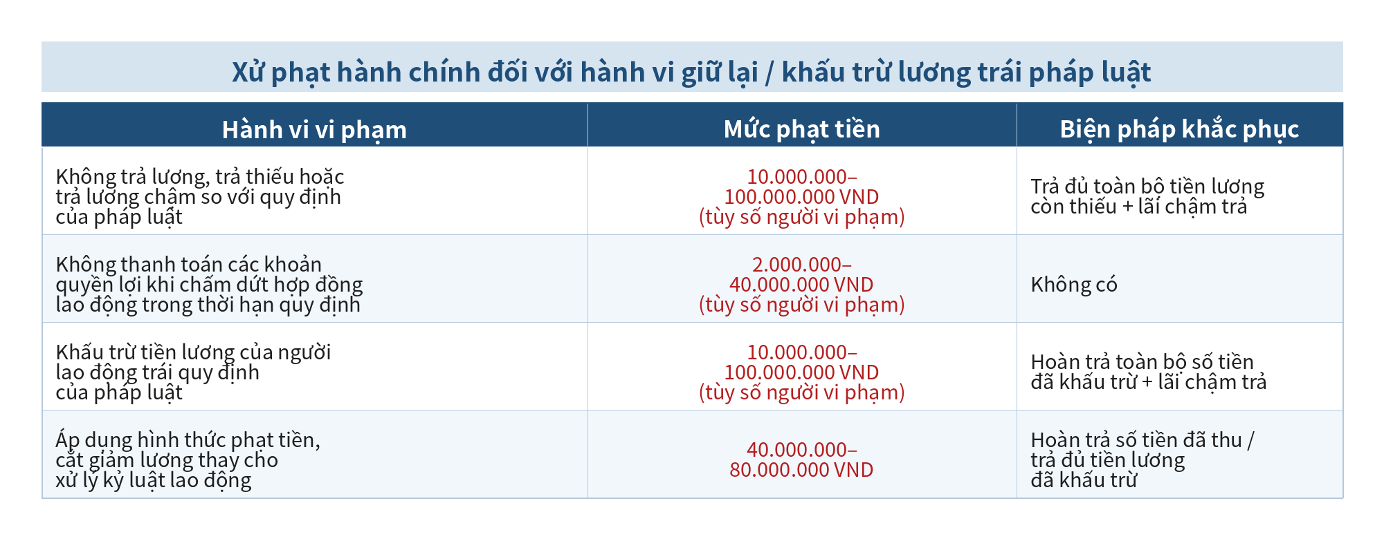 Theo đó, việc tạm giữ hoặc khấu trừ tiền lương của NLĐ trái với quy định có thể kéo theo nhiều hệ quả pháp lý đối với NSDLĐ. Trước hết, NSDLĐ có thể bị xử phạt vi phạm hành chính trong lĩnh vực lao động. Chi tiết theo bảng dưới đây: